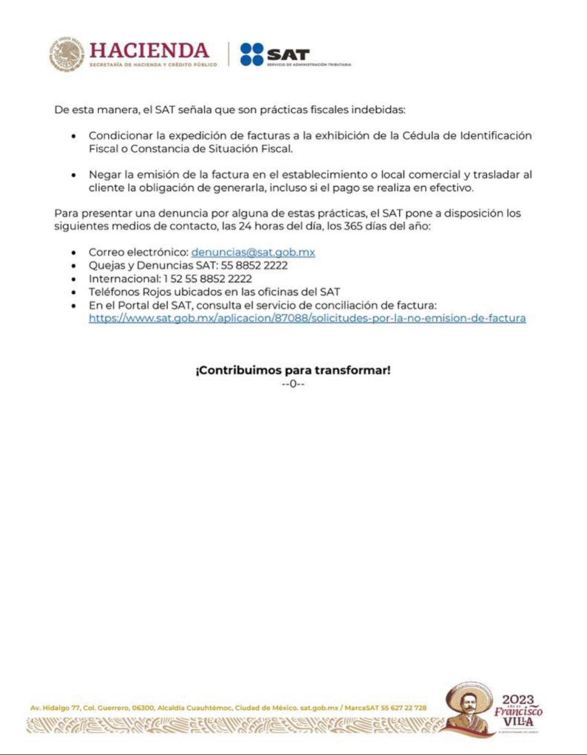 Asimismo, señaló que es una práctica fiscal indebida, que los comercios y establecimientos nieguen la expedición de una factura en el momento de la transacción, y dirección al contribuyente a sitios web para ingresar datos y generar su factura, incluso si el pago se realizó en efectivo.